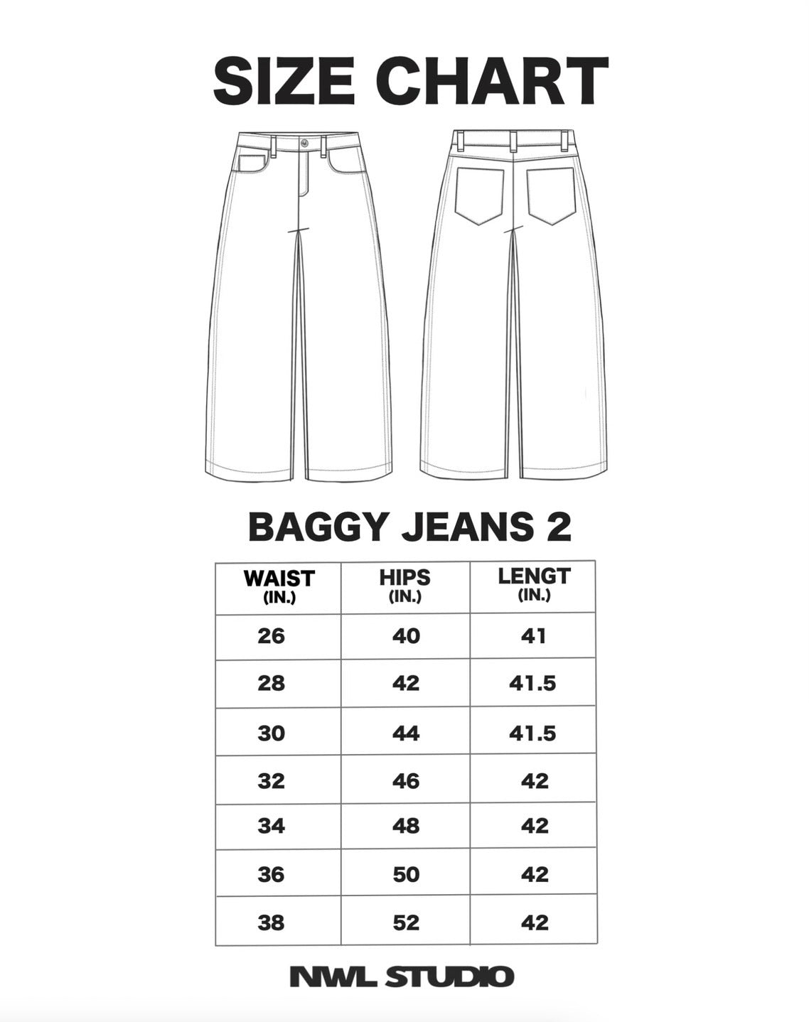 Customers can view this size chart, which includes 7 sizes: 26/28/30/32/34/36/38.