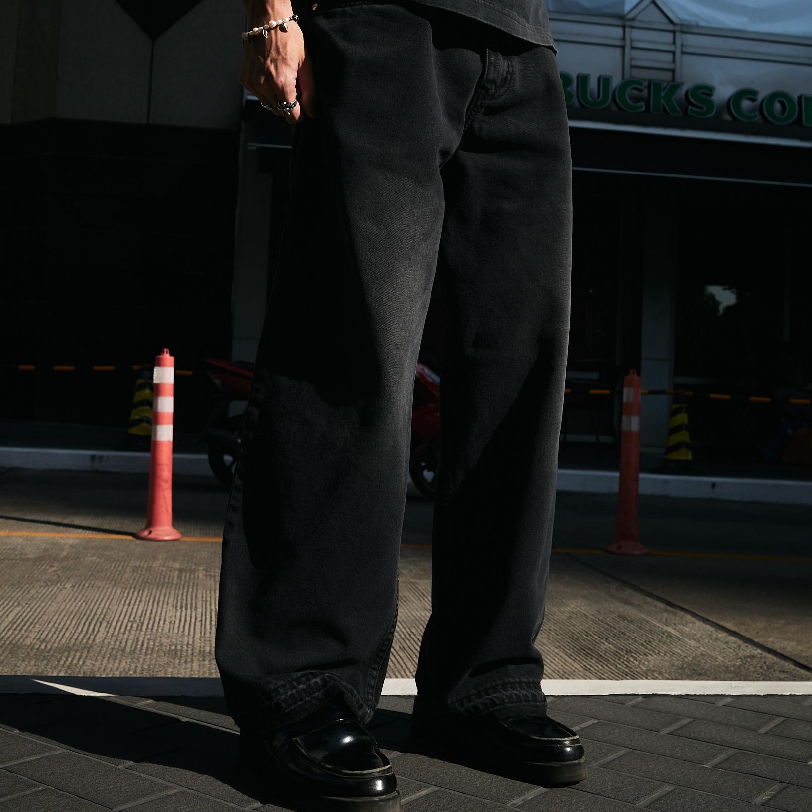 These faded black Baggy jeans with distressed hems are a standard, easy-to-wear style suitable for any occasion. This design is tailored to fit Asian body types, both in fabric and pattern. The distressed hem adds a unique detail to the overall look.